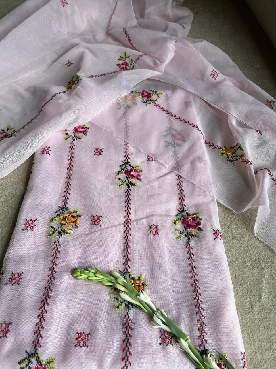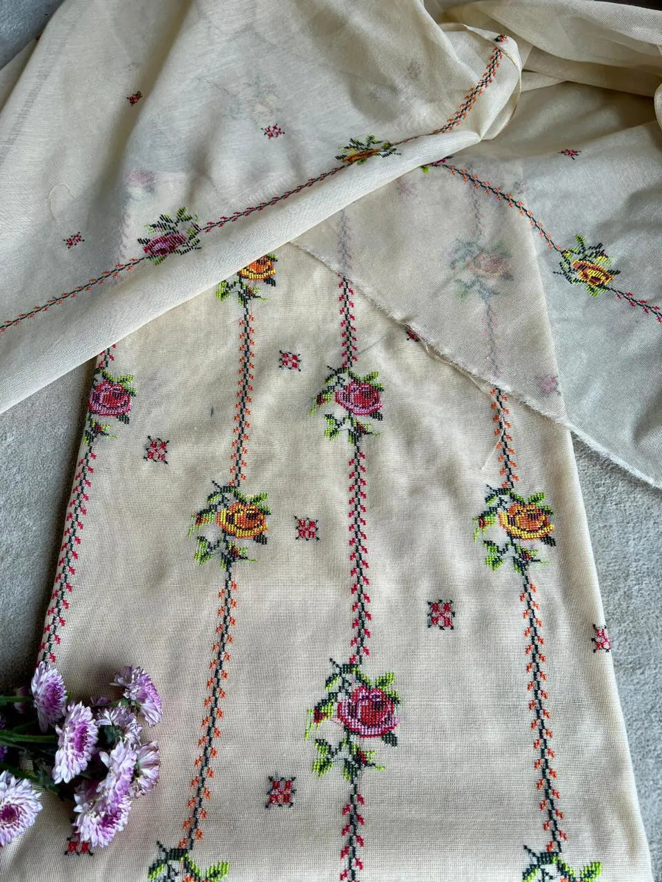 Unveiling our latest Cottonet two-piece—featuring a beautifully hand-embroidered intricate floral cross-stitch details.