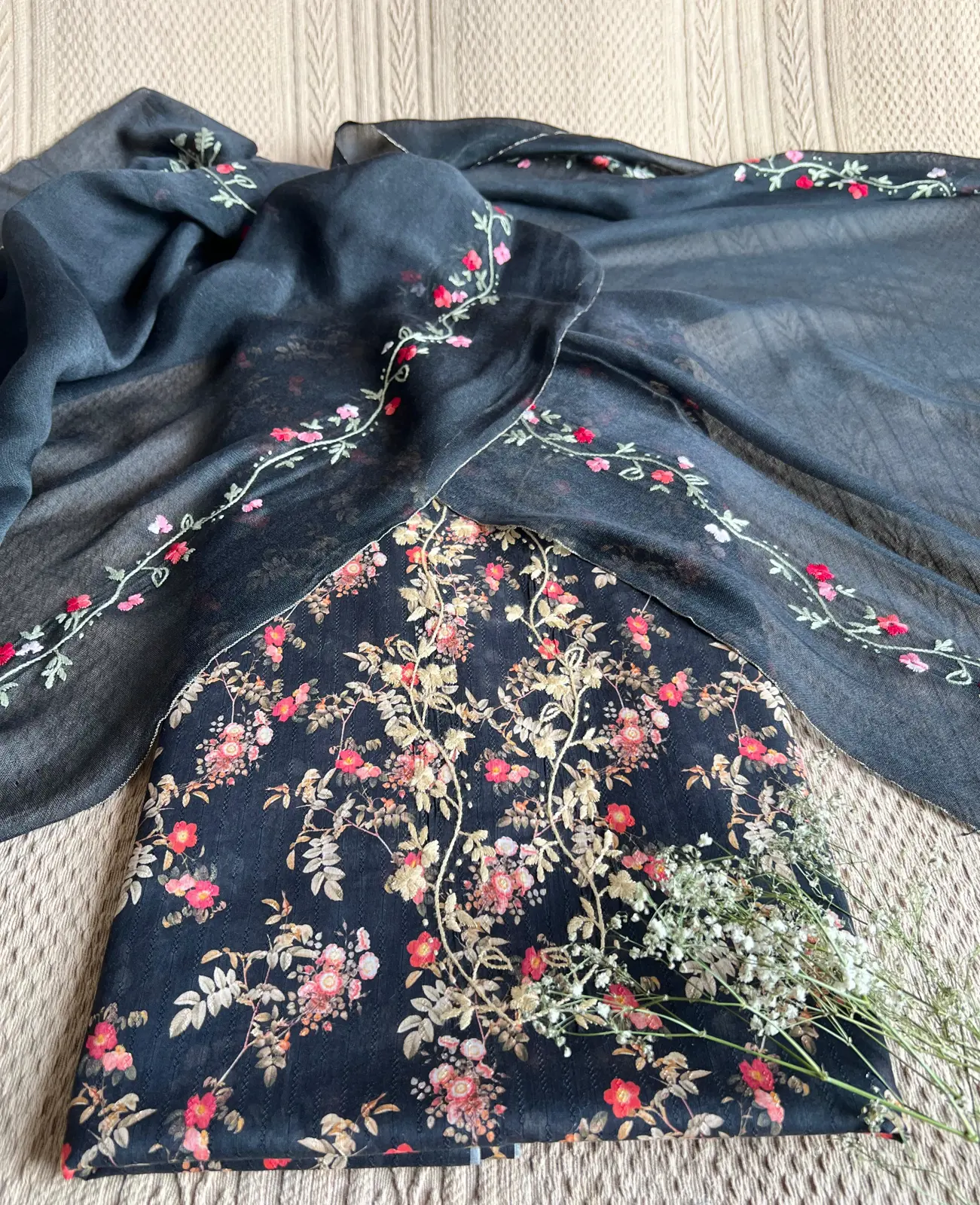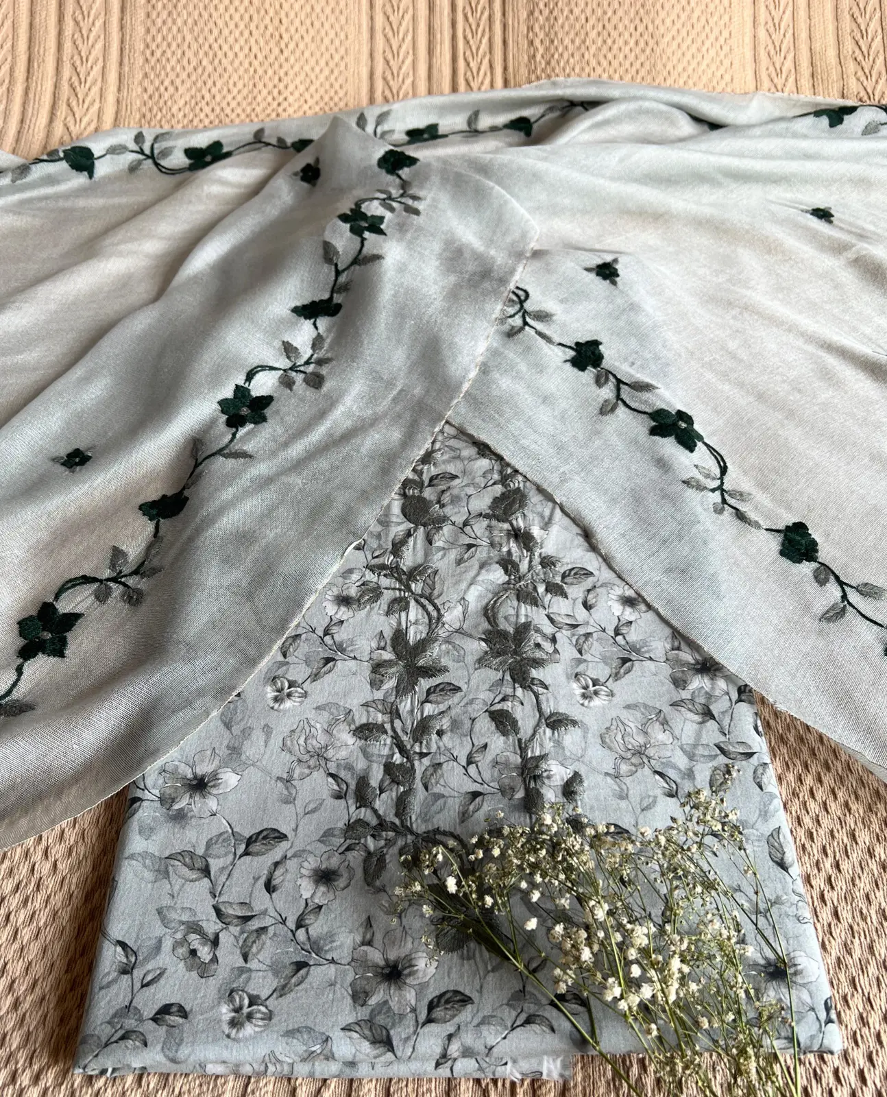 Each piece is hand-matched, embroidered, and passed from artisan to artisan, bringing to life a tale of timeless floral grace.
