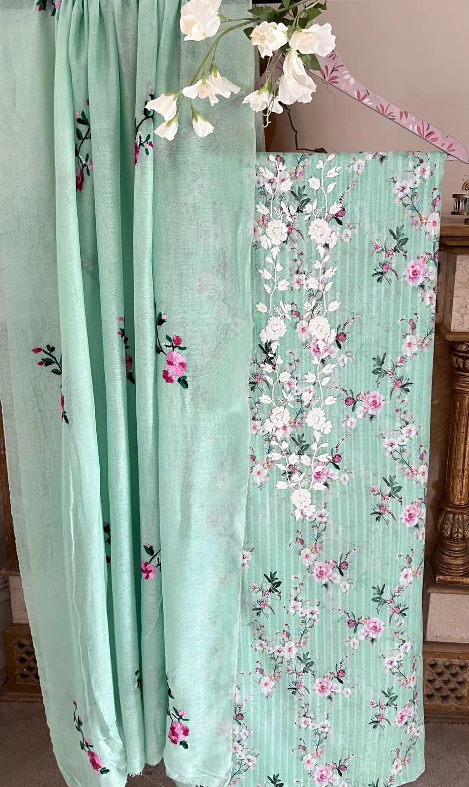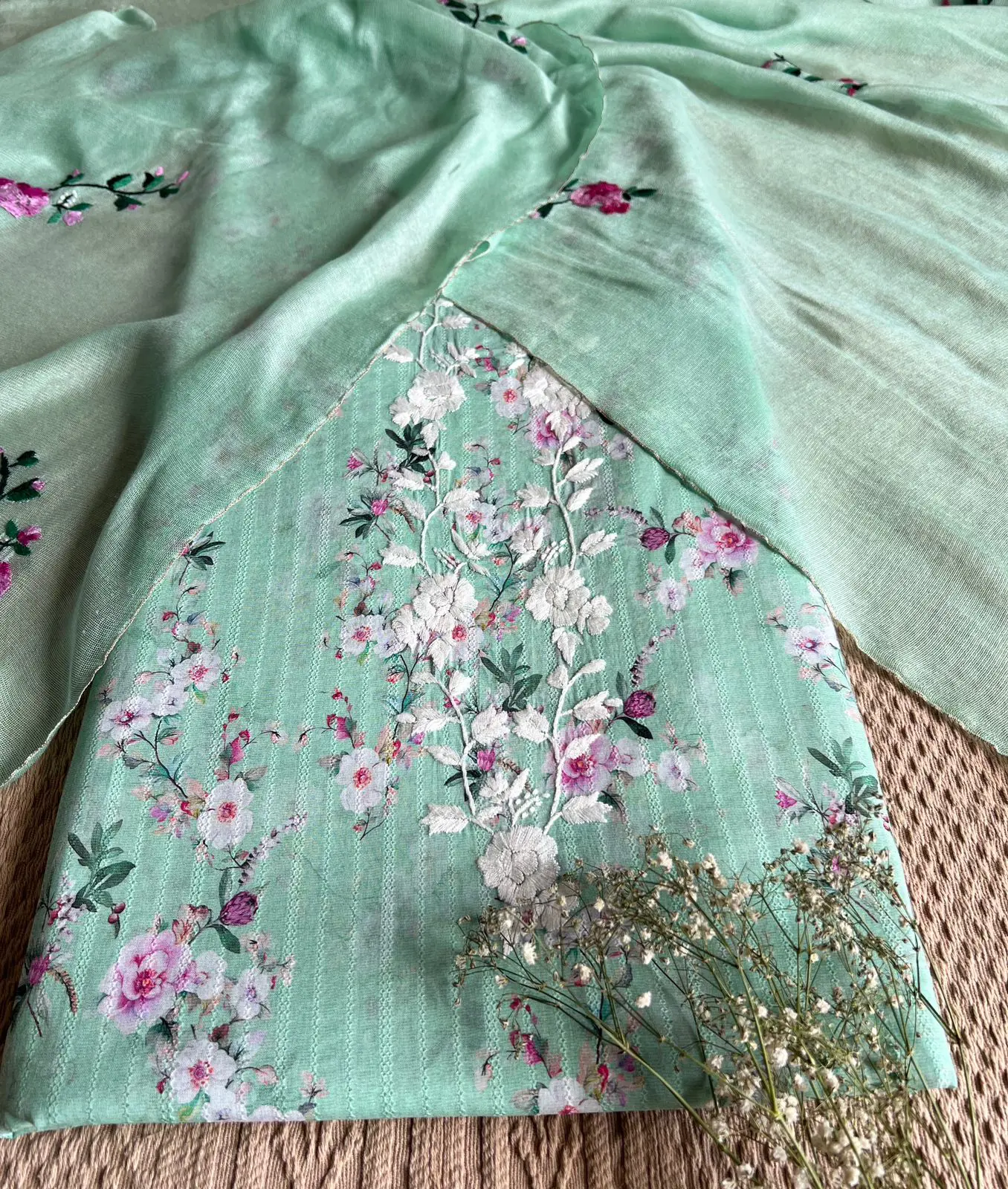 Each piece is hand-matched, embroidered, and passed from artisan to artisan, bringing to life a tale of timeless floral grace.
